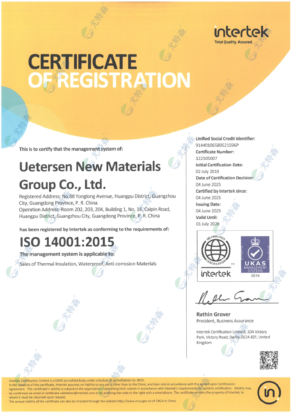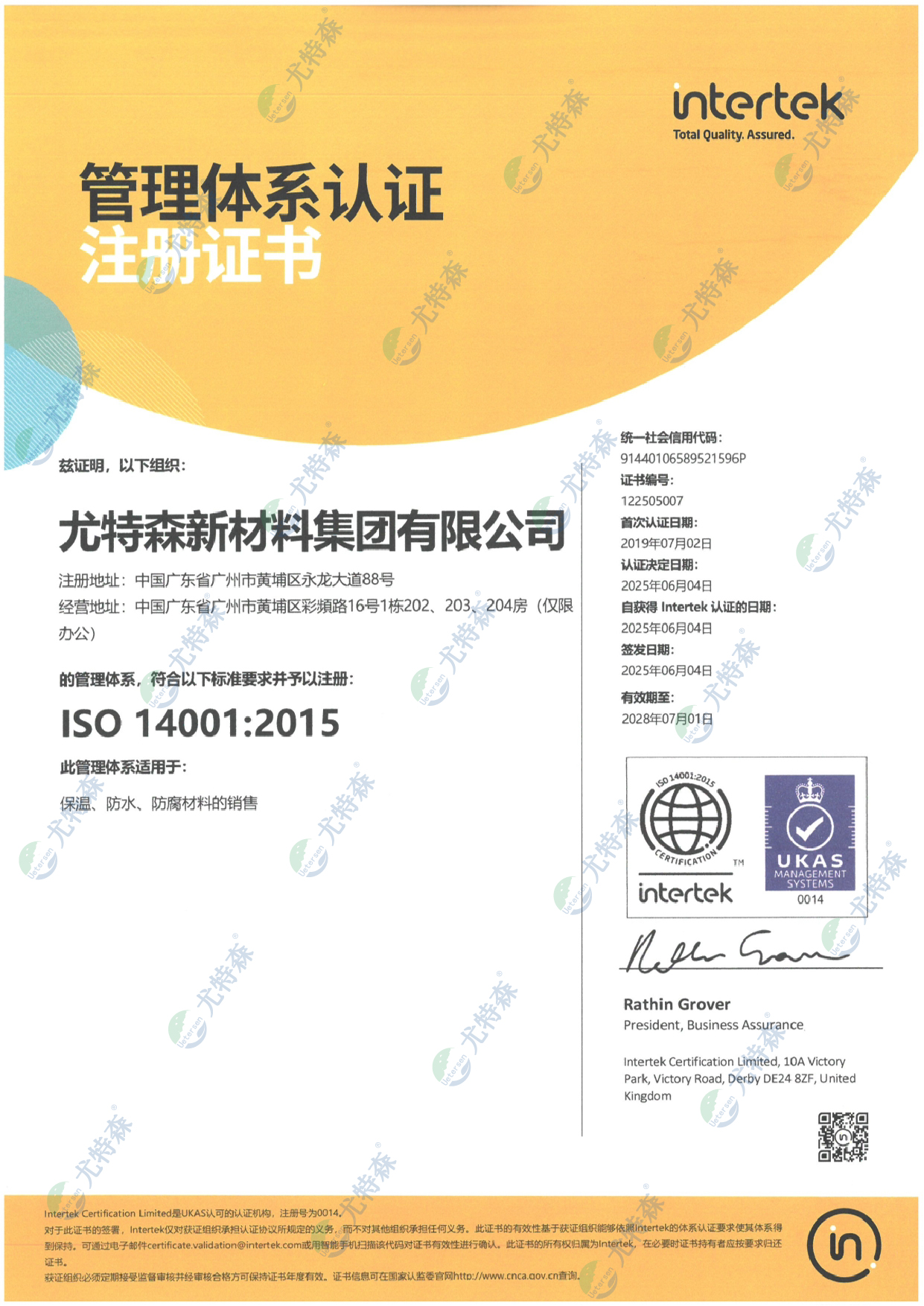 尤特森ISO证书:14001-2015(英文版)